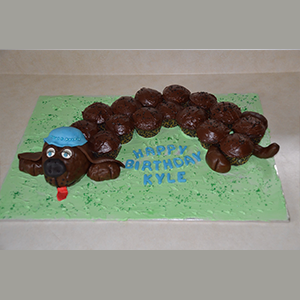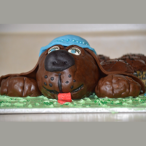 Scrumptious chocolatey cupcakes speckled in dark chocolate chips extend behind this blue-bonneted pooch. Available in regular and gluten-free!