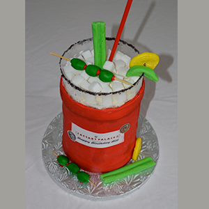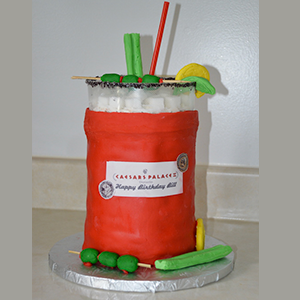Raise your glass to this clamato-drink-inspired dessert topped with edible garnishes. A rich strawberry-flavoured coating wraps around a moist, fluffy red velvet cake.